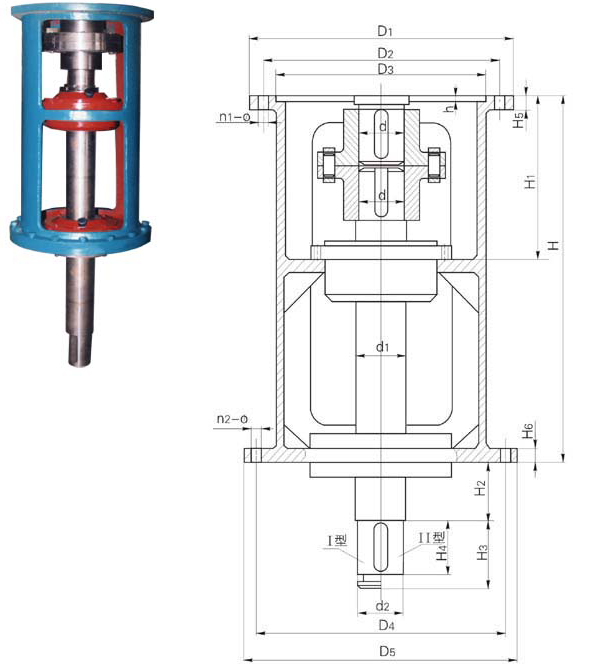 | 机架型号 | 减速机 | D1 | D2 | D3 | n1-φ | D4 | D5 | n2-φ | d | d1 | d2 | h | H | H1 | H2 | H3 | H4 | H5 | H6 |