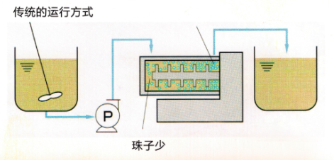 传统磨机的运行方式 1. 粒度难以控制,分散不充分; 2. 粒度分布往往较宽; 3. 无法控制物料的温度; 4. 在大流量高速运转时,磨介易聚集在腔体一侧,容易堵塞在出料口。 |