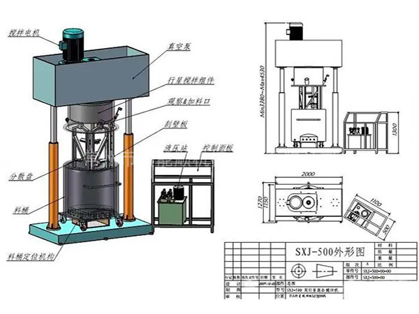 双行星混合搅拌机是一种对多种液体、粉体进行混合搅拌、溶解、分散、均质的搅拌设备,分为减速电机、封盖、行星架,高速、低速、活动刮板三轴,刮壁器、料桶、双柱液压升降系统、真空系统以及机架等构成。双行星混合搅拌机能在真空下工作,可不断的排出水分和其他的挥发物,因此,可作为脱气釜使用。料桶可根据需要采用油、水循环加热或冷却;也可使用蒸汽加热。加热温度通过控制面板上的温度控制仪显示。行星分散混合机(行星搅拌机)广泛应用于高粘度电池、涂料、有机硅胶、油墨、染料、粘胶剂等。